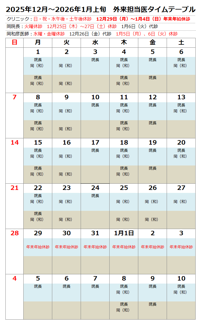 岡親弘院長:12月25日(木)~27日(土)休診 1月6日(火)代診